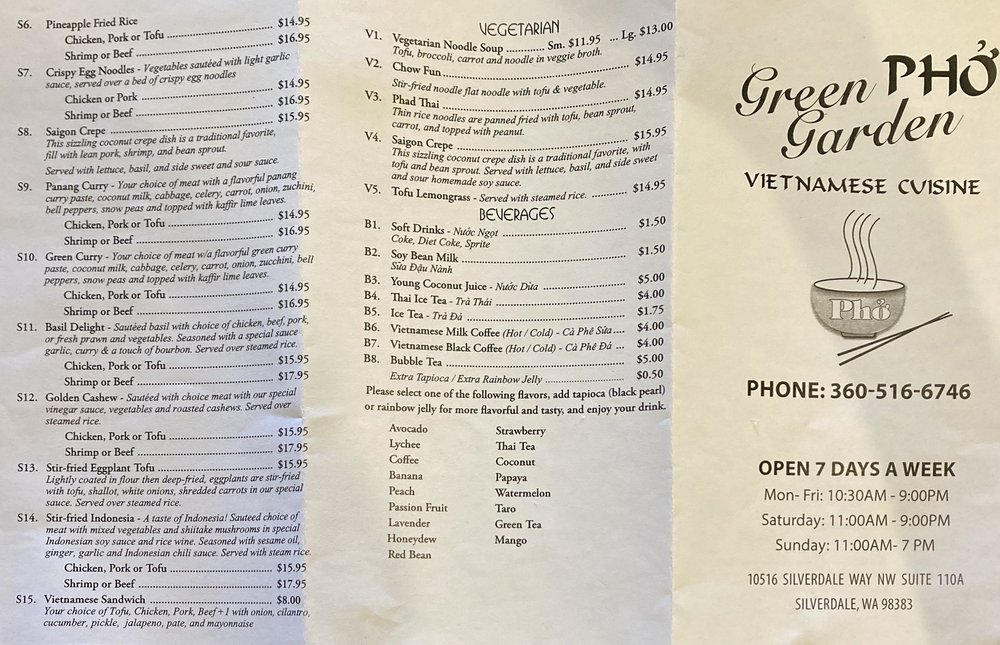 Welcome to Green Garden Pho, a Vietnamese noodle restaurant located in Silverdale, WA. Known for its vegetarian options and authentic flavors, Green Garden Pho offers a variety of dishes catered to both vegan and vegetarian diners. Customers rave about the excellent service, fast to-go options, and welcoming atmosphere. The menu features traditional pho bowls with flavorful broth, steak and brisket options, and a variety of other dishes such as vermicelli noodle bowls and crispy garlic chicken. The restaurant also offers fish cakes, a Vietnamese crepe, and delicious spring rolls. With a cozy ambience and friendly staff, Green Garden Pho is a must-visit spot for pho lovers and those looking for a taste of authentic Vietnamese cuisine.